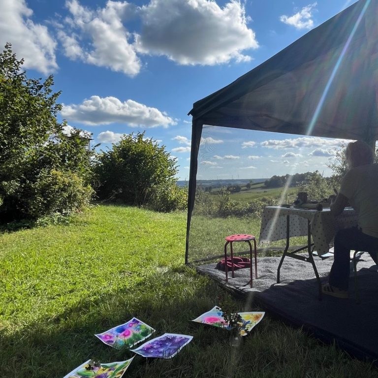 In meinem kleinen, gemütlichen Atelier stehen zahlreiche hochwertige Materialien und Malwerkzeuge bereit. Meditation, Klänge und Düfte helfen, in die Ruhe und innere Ausrichtung zu kommen.