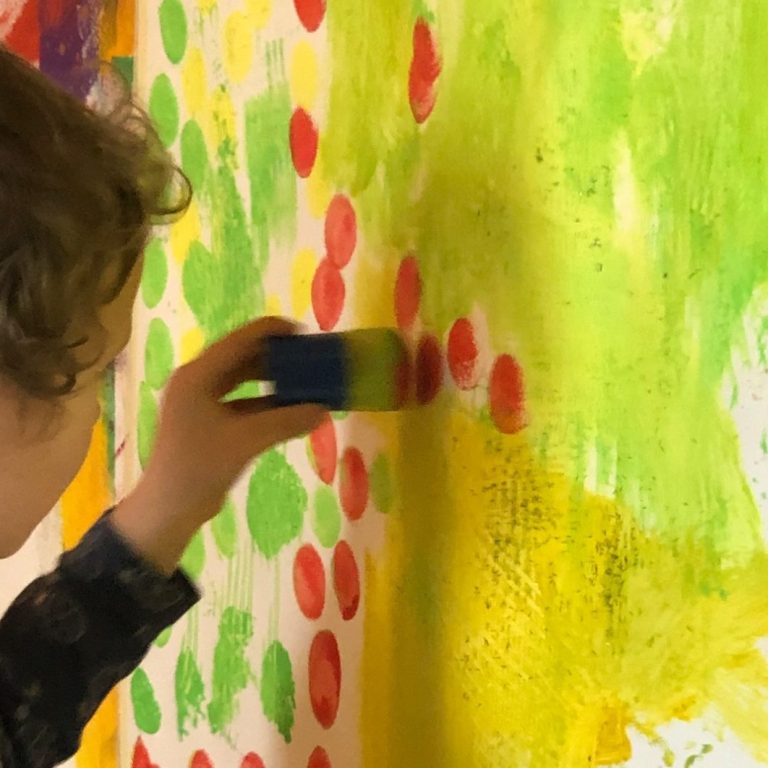 Den Kindern stelle ich auch sehr großformatiges Papier zur Verfügung. Gemalt wird mit den Händen, Pinseln oder anderen kreativen Werkzeugen.
